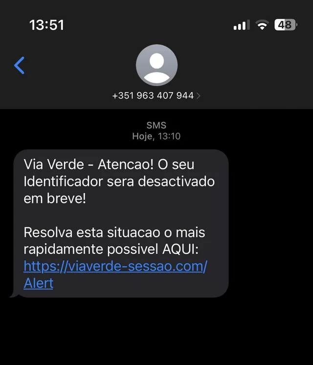 A burla usa um SMS ameaçando a desactivação do identificador da Via Verde e apela a que “rapidamente” a vítima tome ações “urgentes” (o que é, desde logo, um sinal de alerta).