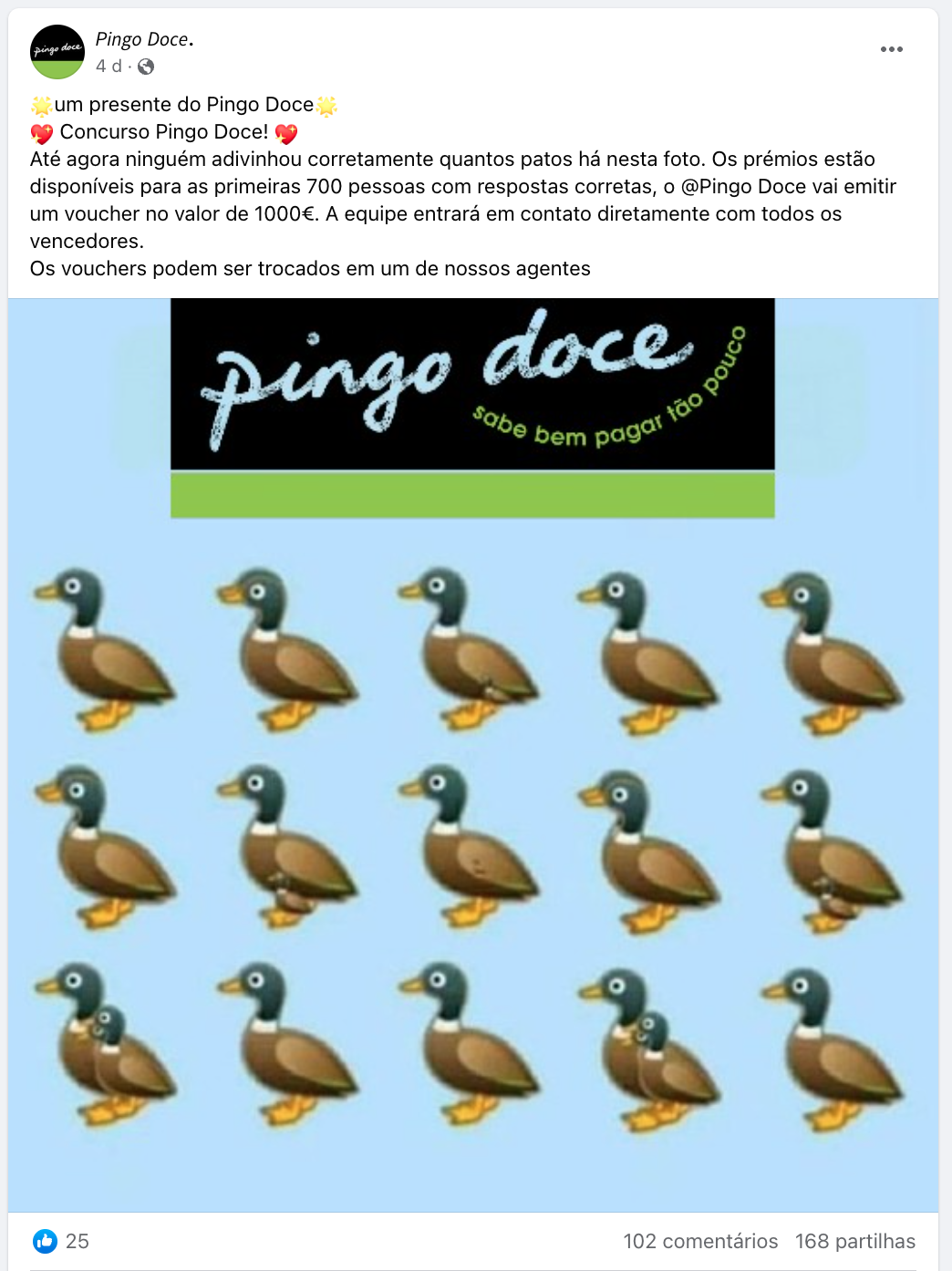 Até agora ninguém adivinhou corretamente quantos patos há nesta foto. Os prémios estão disponíveis para as primeiras 700 pessoas com respostas corretas, o @Pingo Doce vai emitir um voucher no valor de 1000€. A equipe entrará em contato diretamente com todos os vencedores.