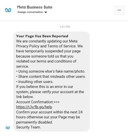 Nos últimos dias foram-nos enviadas uma série de mensagens que diziam vir do “Meta Security Team“, “The Meta Business Support“, três em inglês e uma em francês com variantes de texto invocando que a página tinha sido suspensa devido a violações de direitos de autor.