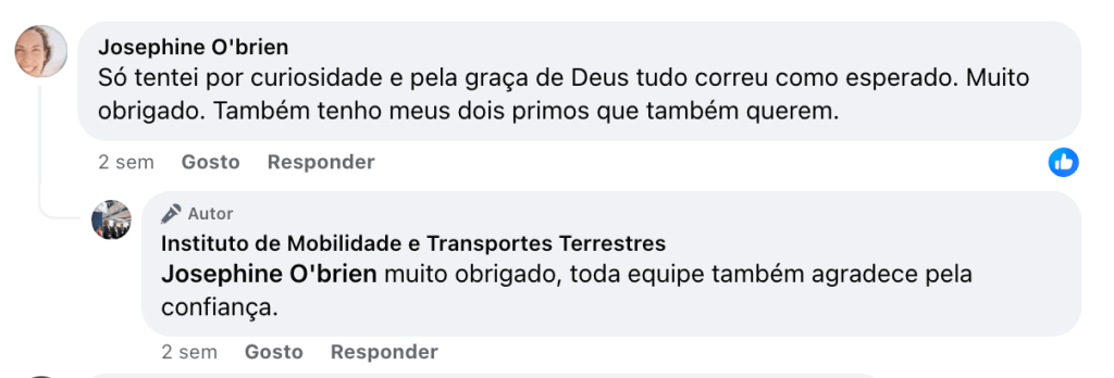 Activos na página deste falsário estão vários perfis falsos que, pelo estilo, são operados pela mesma pessoa. Estes perfis agem como seguidores que elogiam o “serviço” vendido pela página: um diz estar “realmente emocionado” outro diz que “fui parado pela polícia para verificação” e que “graças a Deus minha carta foi registada correctamente” (leia-se “falsificada”), outro proclama que “convive” com esta estrutura há 3 anos e, de facto sabemos que andam por aí – Impunemente – graças à inércia da Meta (Facebook) desde 2022. Um deste panegiristas de serviço diz mesmo que “você é simplesmente patético” (um elogio distorcido por uma má tradução automática). Entre estes vários perfis falsos encontramos Josephine O’brien: