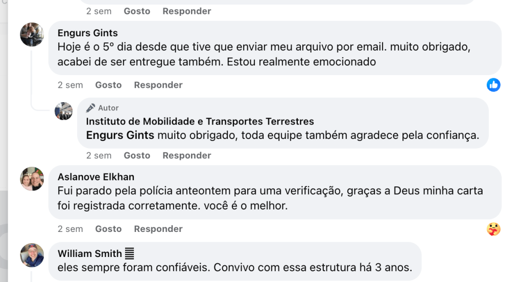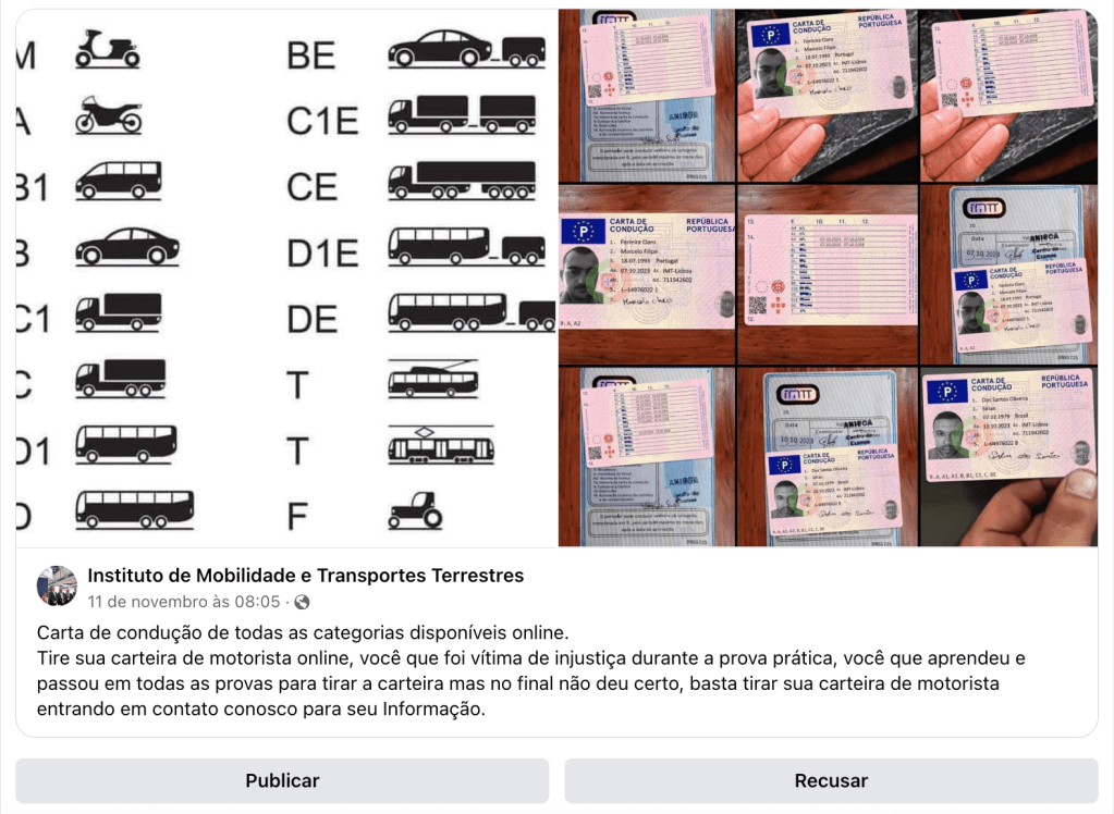 https://www.facebook.com/profile.php?id=100088056097924 do “Instituto de Mobilidade e Transportes Terrestres” é a mais activa (desde meados de Novembro) com mais de 150 partilhas em vários grupos de facebook e milhares de visualizações ligados ao sector automóvel. A página é apenas uma entre várias onde se promove descaradamente a falsificação de cartas de condução em vários países europeus. À data destas linhas o falsário vendia cartas de condução, além de Portugal (onde parece concentrar o essencial da sua actividade) na Lituânia, Reino Unido e Espanha com os nomes: