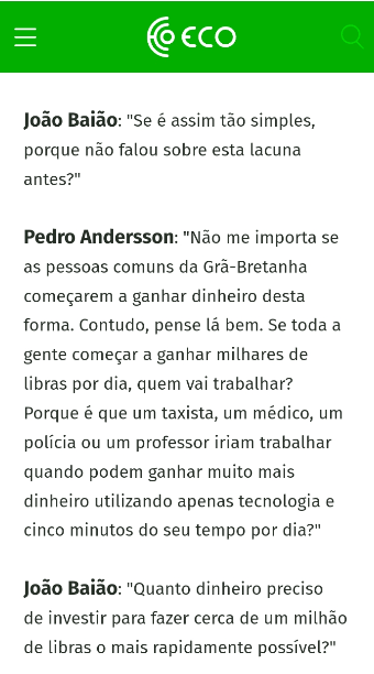 De permeio o falso Pedro Andersson menciona alguns termos da moda como “Inteligência Artificial”, “Criptomoedas”, “auto-aprendizagem”, “37 indicadores profissionais” e “algoritmo”. Mas, a dado ponto e indicando a origem da burla refere que “as pessoas comuns da Grã-Bretanha começarem a ganhar dinheiro desta forma”.