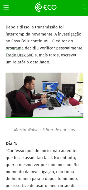 O conceito base é que de “não é preciso trabalhar para ser rico” e apresenta a dado ponto um link para a “plataforma Trade Urex 500” e “vou fazer um milhão em apenas 12 a 15 semanas!” (falso). O link aponta para o site tradesimplex.com com a descrição “Trade Urex 500” (que existe e, embora mal afamada pela opacidade e avaliações de utilizadores) e pede dados pessoais: