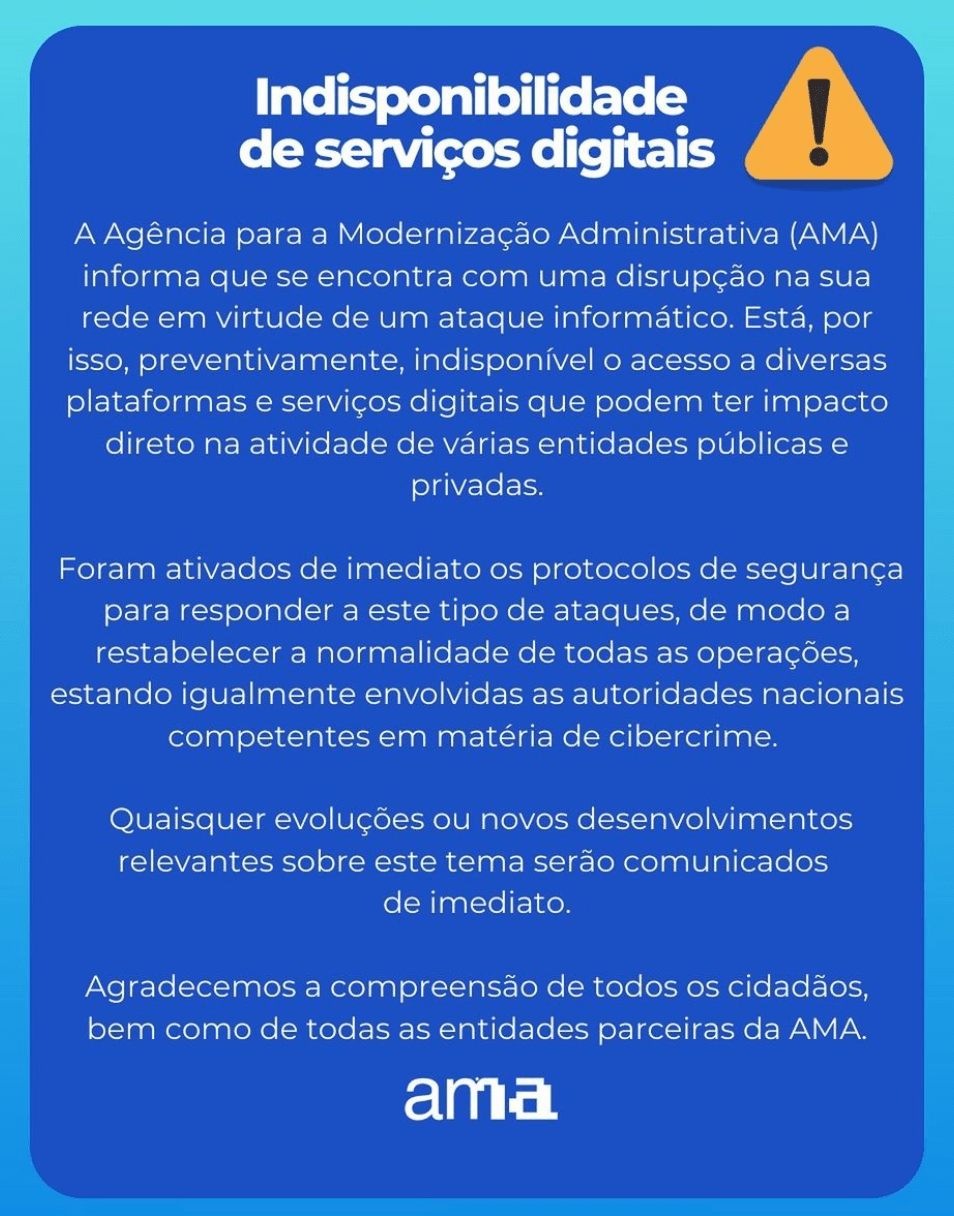 A AMA mantém o compromisso de repor a normalidade dos serviços digitais e continua a trabalhar em estreita colaboração com as autoridades nacionais competentes em matéria de cibersegurança e cibercrime para restabelecer tão breve quanto a segurança permita o pleno funcionamento das operações.