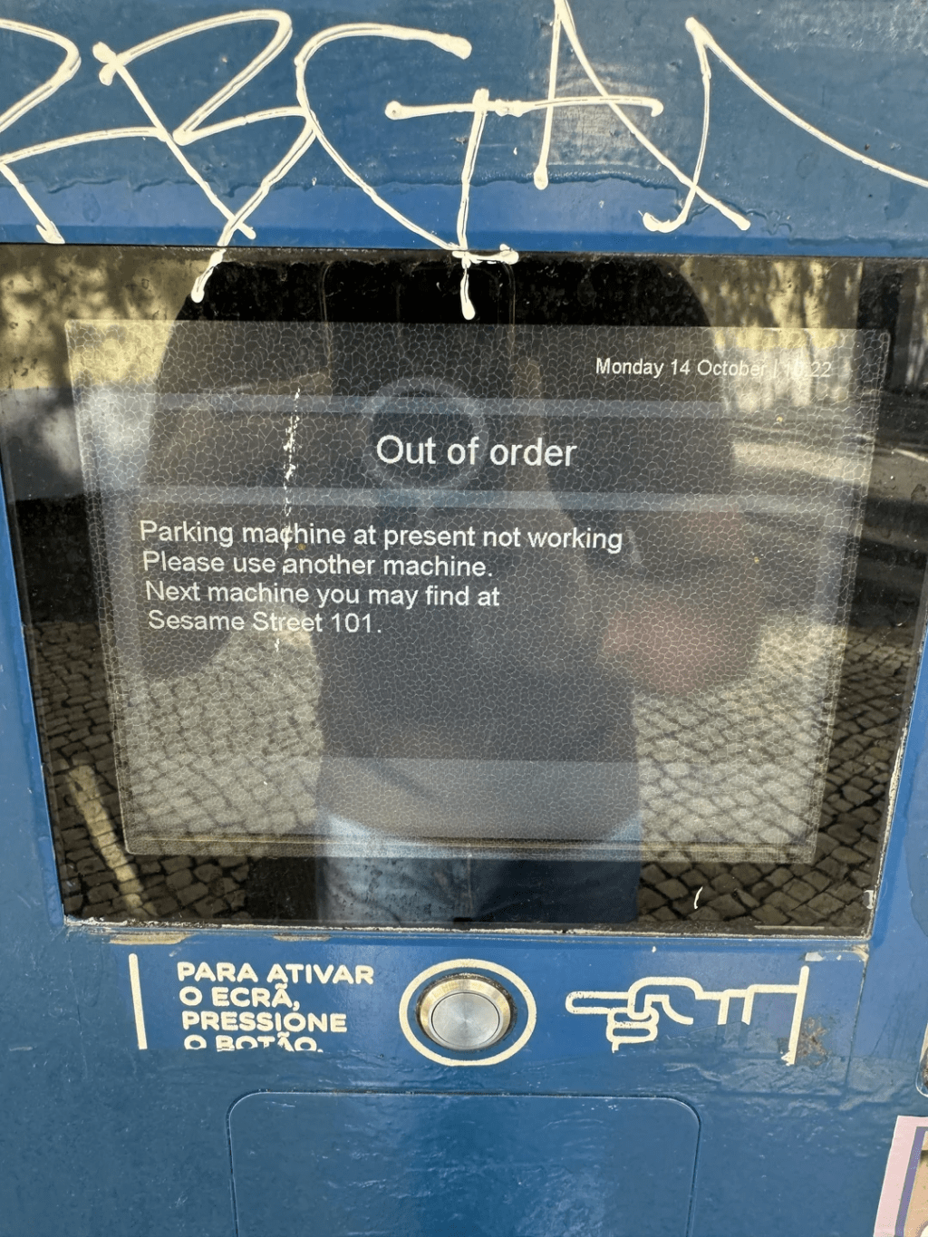Pelas 11:00 de 14.10.2024 alguns (?) parquímetros em Lisboa exibiam uma mensagem para que o utente se dirija ao parquímetro mais próximo na “Sesame Street 101”