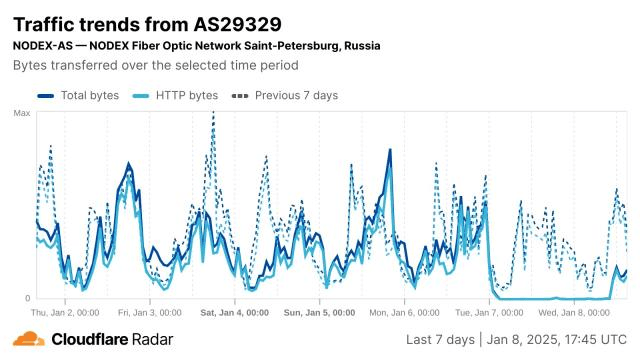 De acordo com dados da Cloudflare, empresa especializada em monitorização de tráfego e tendências da internet, a interrupção começou na noite de 6 de janeiro e mantém os níveis de tráfego a 0% para os clientes da Nodex.