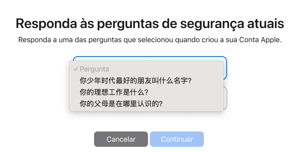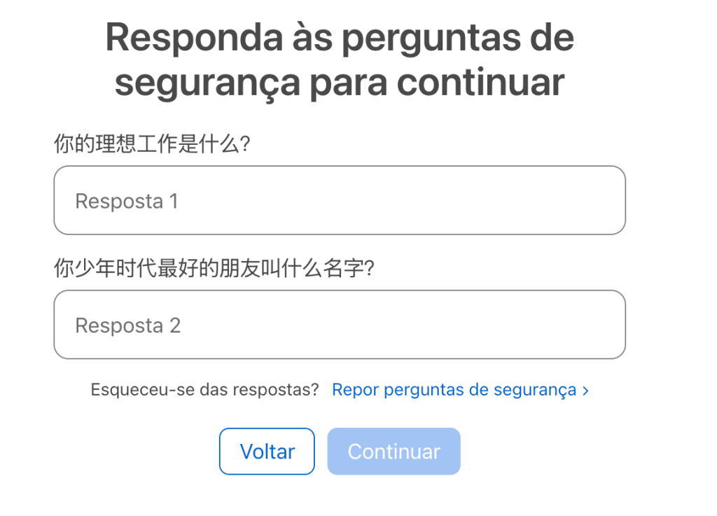 Foi dado o Sign Out na conta actual e feito o acesso na conta comprometida, feito o reset da password para o email associado (que ainda estava sob controlo do utilizador atacado). Contudo, para prosseguir com o login o Apple Account pedia a resposta às questões de segurança (que era o método de recurso em 2017) sendo estas apresentadas em caracteres chineses (uma manobra por parte do cibercriminoso para dificultar a recuperação da conta):
