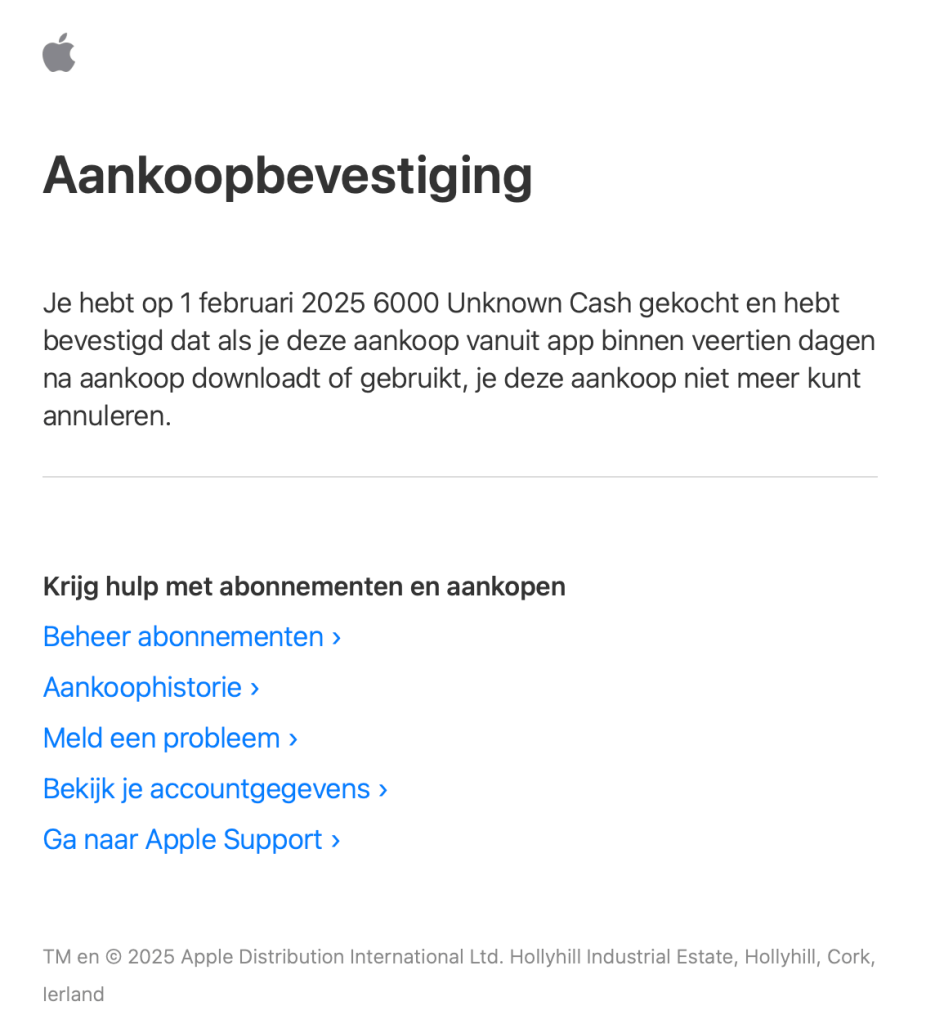 Je hebt op 1 februari 2025 3000 Unknown Cash gekocht en hebt bevestigd dat als je deze aankoop vanuit app binnen veertien dagen na aankoop downloadt of gebruikt, je deze aankoop niet meer kunt annuleren.”