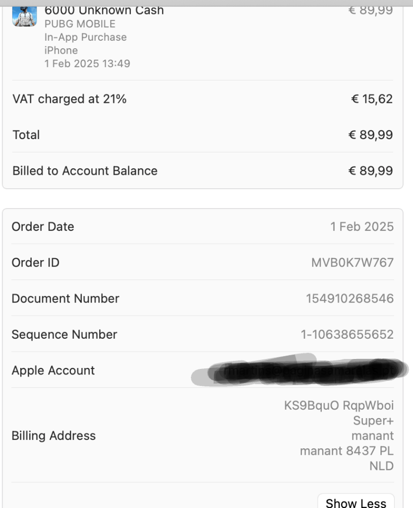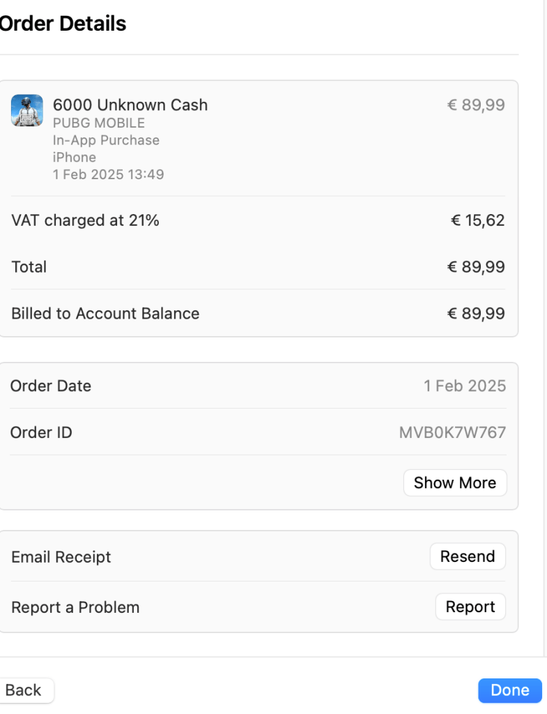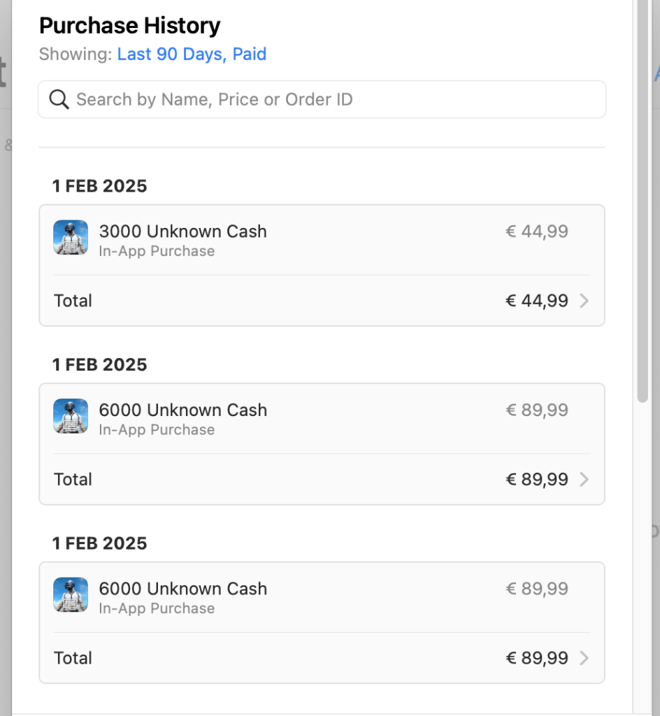 Neste caso as compras na App Store foram de créditos para o “PUBG MOBILE (PlayerUnknown’s Battlegrounds Mobile)” um jogo de batalha em tempo real disponível para dispositivos móveis iPhone e Android. No jogo, até 100 jogadores são lançados numa ilha, onde lutam até restar apenas um vencedor. Os jogadores recolhem armas, equipamentos e recursos enquanto a área jogável diminui gradualmente. O jogo é extremamente popular na Ásia e oferece uma experiência multiplayer, incluindo modos solo, em dupla ou em equipa. As compras dentro do aplicação, como a mencionada “6000 Unknown Cash”, permitem que os jogadores adquiram itens cosméticos, skins de armas, roupas e outros recursos no jogo.