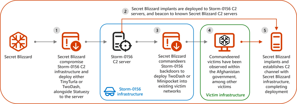 Desde fevereiro de 2025, a Microsoft Threat Intelligence observou uma possível colaboração entre os grupos russos Aqua Blizzard e Secret Blizzard com o objectivo de comprometer dispositivos militares ucranianos. Com efeito, o Secret Blizzard implantou o malware KazuarV2 em dispositivos previamente infectados pelo Aqua Blizzard, sugerindo que este último realizou a invasão inicial antes de entregar o acesso. Essa é a primeira vez que a Microsoft identifica interacção entre esses dois grupos, ambos ligados ao Serviço Federal de Segurança russo (FSB).