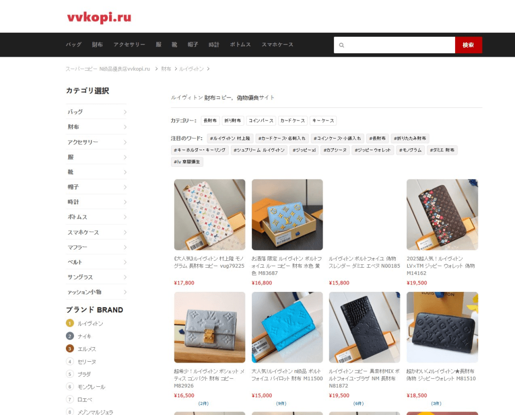 Hoje, 21.04.2025, pelas 1546 surgia uma página de um site de vendas vvkopi.ru, uma loja online de produtos falsificados (réplicas), mais especificamente de carteiras e acessórios de marcas de luxo como Louis Vuitton mas escrita em katakana, um dos sistemas de escrita do japonês com a palavra “コピー” que pode ser lida como “kopī” o que significa “cópia”, geralmente usada no Japão para se referir a réplicas ou imitações e de facto, a dado ponto no site aparecia “Carteiras Louis Vuitton falsificadas, site de réplicas de qualidade”