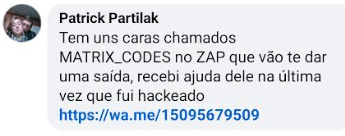2. Linguagem genérica e apelativa: Frases como “MATRIX_CODES vai te ajudar a recuperar sua conta” são vagas e não têm nenhuma associação real com suporte técnico de plataformas legítimas (como Google, Instagram, Facebook etc.) e dão a entender que se trata de um “hacker experiente”.