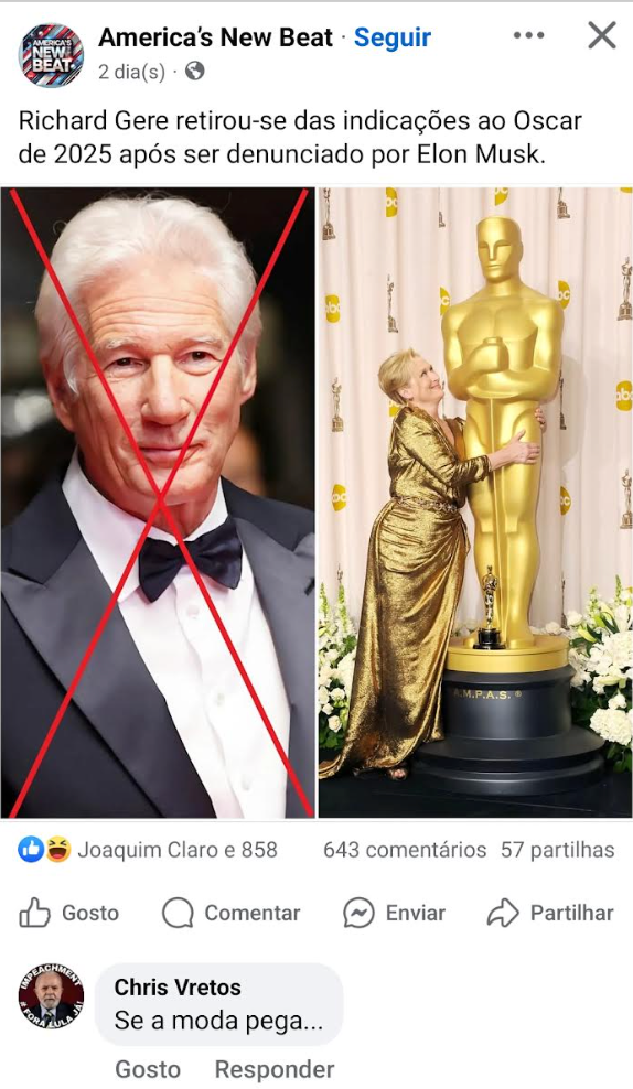 “Richard Gere retirou-se das indicações ao Oscar de 2025 após ser denunciado por Elon Musk”