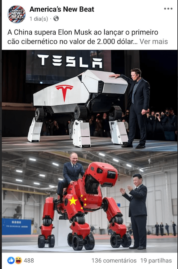 “A China supera Elon Musk ao lançar o primeiro cão cibernético no valor de 2.000 dólares” e imagens falsas do dito robort com Xi e Putin (!) montado sobre o dito cão-robot.