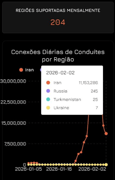 Porque surge com força agora com um pico de 29 milhões de conexões do Irão a 29.01.2026 num crescimento que subiu quase do zero a 22.01.2026