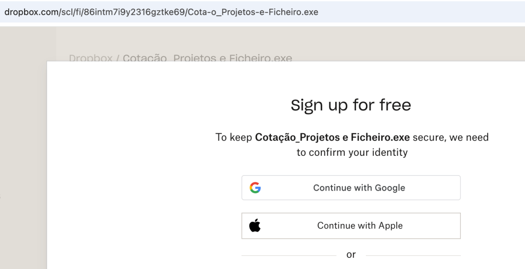 No dia 27 de fevereiro de 2026 foi detetada uma campanha de phishing que utilizou a infraestrutura legítima do Dropbox para alojar um ficheiro malicioso identificado como Cota-o_Projetos-e-Ficheiro.exe.